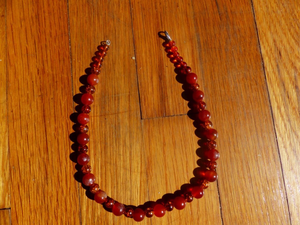 The first has carnelian beads that were originally from a bracelet that was broken. Initially I planned on fixing the bracelet, but decided to give it a new life as a necklace. I added glass beads of a similar look, and created this piece.