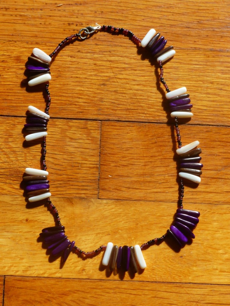 The second is a necklace I started many years ago, (the materials were new at the time) and I just got to finishing this project now. I believe the long beads are made of dyed shell.