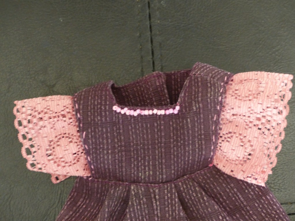 Interestingly, from looking at the seams, it looks like it was a homemade piece to begin with. I then added the pink lace trim( a garage sale bargain) and a few beads to brighten up the neckline. I think it ended up pretty cute! Now I just need to find someone to wear it…